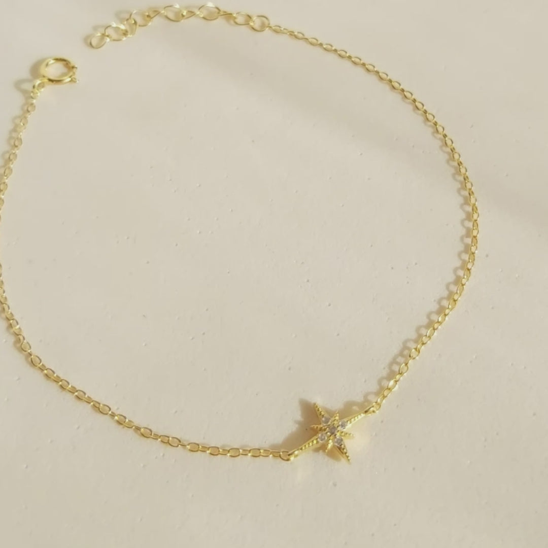 A thin and dainty chain adorned with tiny star charms, each sparkling with a single zircon gemstone. Perfect for a touch of understated elegance. A classic and versatile choice that complements any style.